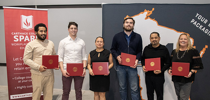 Six LMI Packaging employees earned certificates in Business Foundations for completing a series of classes that Carthage faculty taught on site. The local manufacturer piloted the Carthage Spark program, which features customized workplace-delivered education.