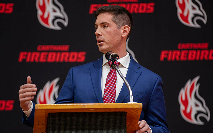 Carthage hired Matt Popino as the Firebirds’ new head football coach. In an introductory press conference, he emphasized the importance of character. Previously at Endicott College in Massachusetts, “Coach Pop” served as defensive coordinator during the Gulls’ three-year run as conference champs.
